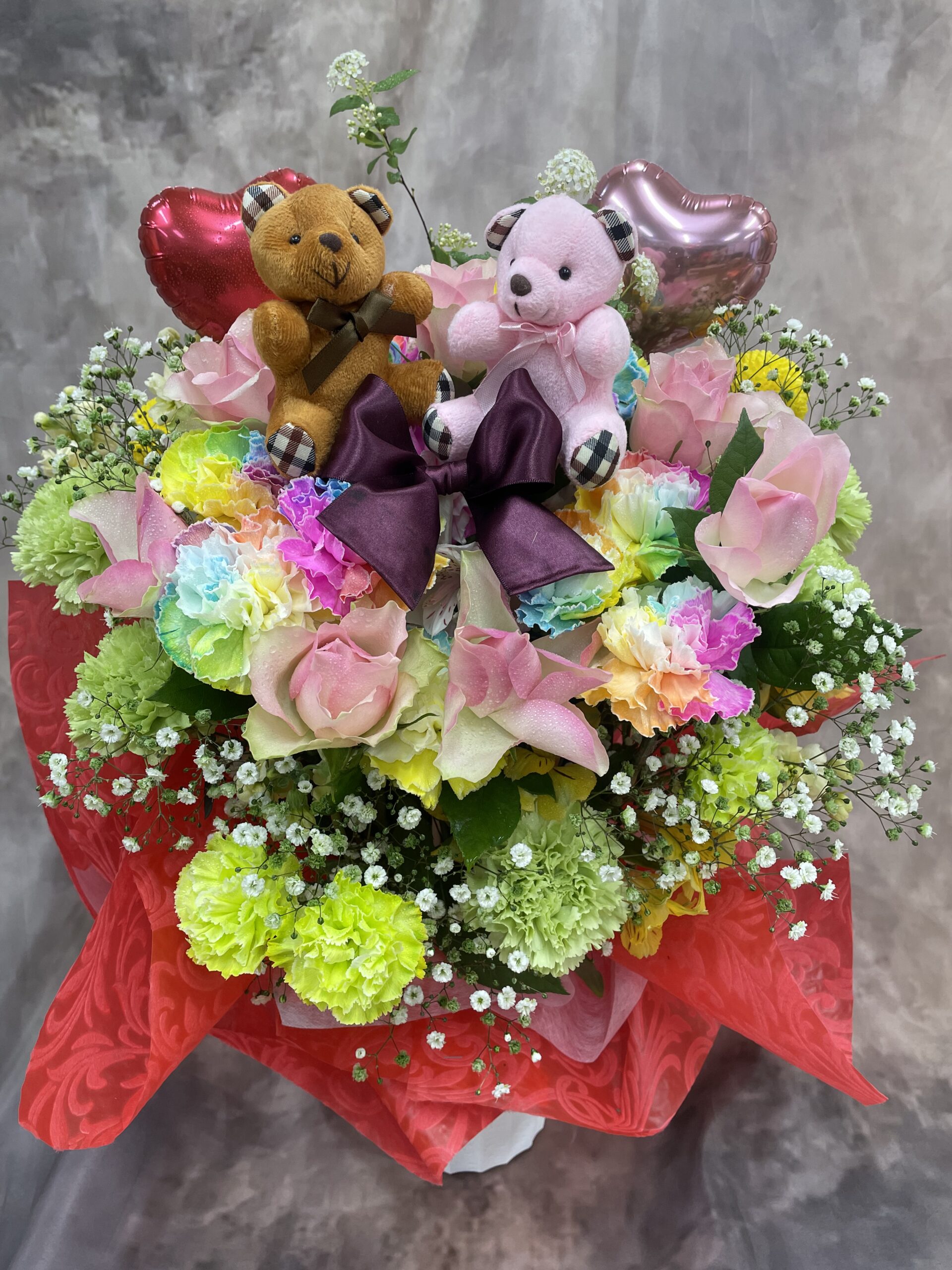 クマのピックとハート型バルーンで、笑顔あふれるお二人を表現した特別なフラワーアレンジメントです。