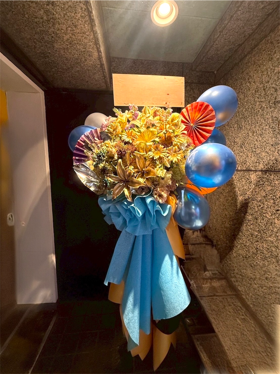 ゴールドの花が印象的な、特別感あふれる周年スタンド花です。