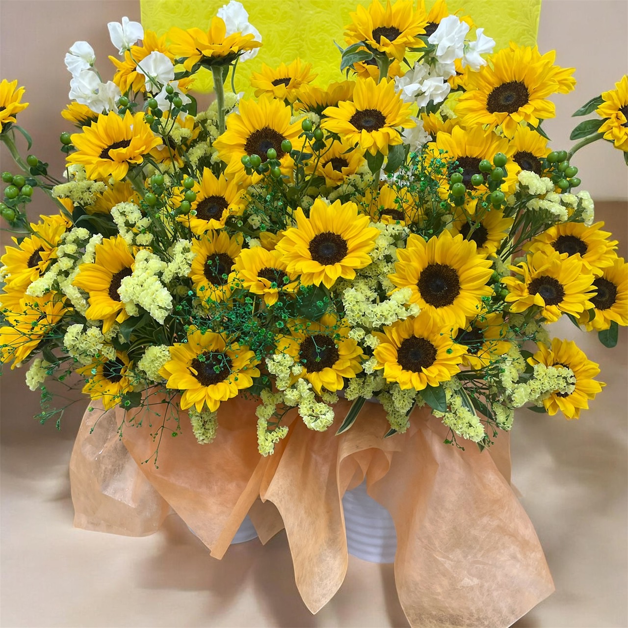 太陽のように明るく咲き誇るひまわりを贅沢に50本使用し、空間いっぱいに元気と華やかさを届ける大型アレンジに仕上げました。高さ90cm・幅80cmのボリューム感は、ひと目で心を惹きつけるインパクト。