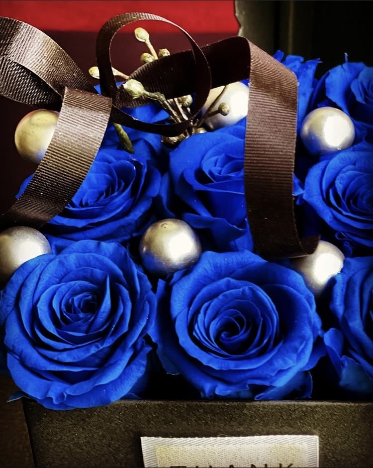 深みのあるブルーが印象的な、プリザーブドフラワーアレンジメント。