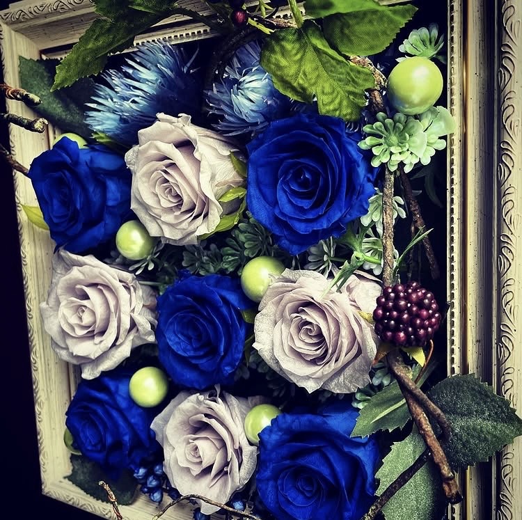 空間を華やかに彩る、壁掛けスタイルのバラアレンジメント。