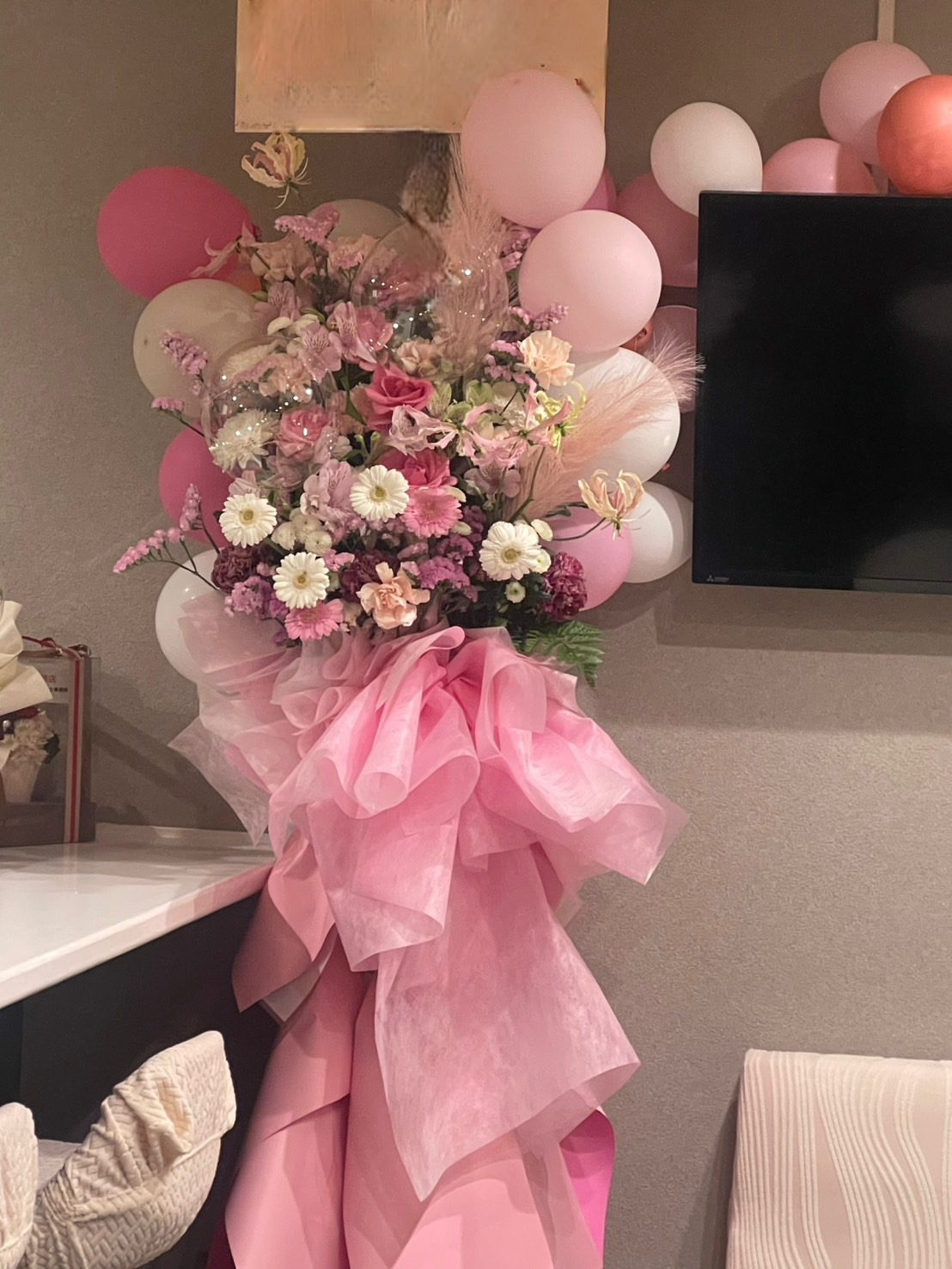 お誕生日のお祝いにぴったりの、白とピンクでまとめた可愛らしいスタンド花。