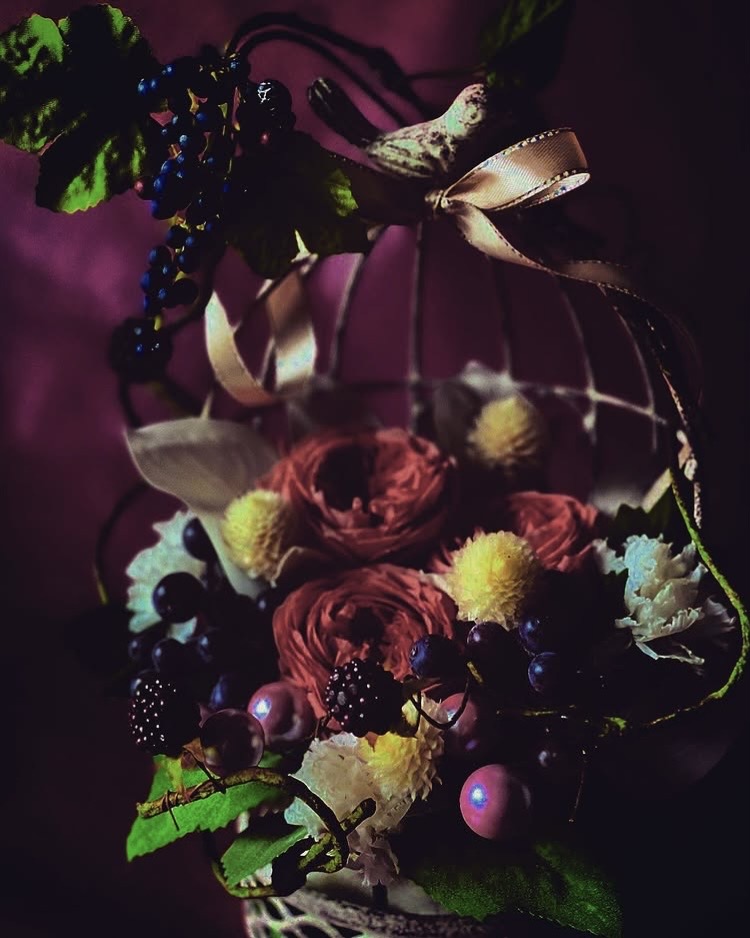 アイアンの器に、物語を閉じ込めたようなプリザーブドフラワーアレンジメント。